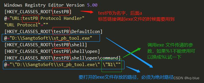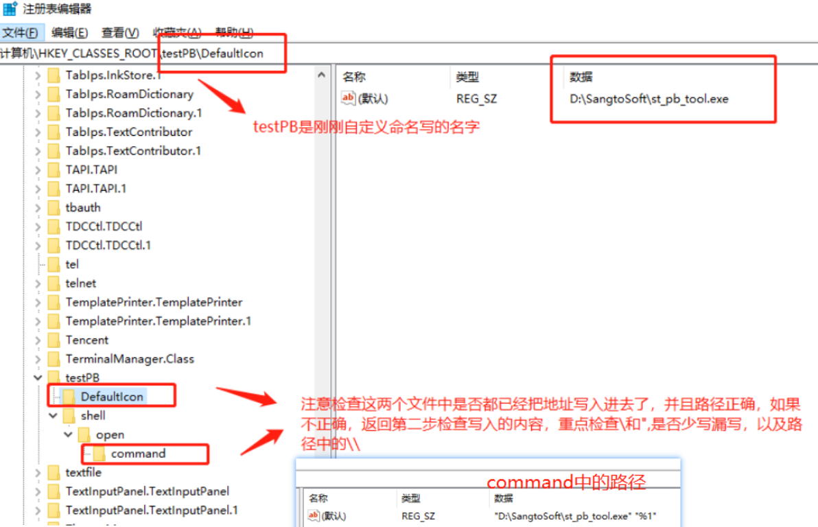 [HKEY_CLASSES_ROOT\testPB\DefaultIcon]中的"D:\\SangtoSoft\\st_pb_tool.exe"是指定应用程序的路径,注意只能是exe的程序;