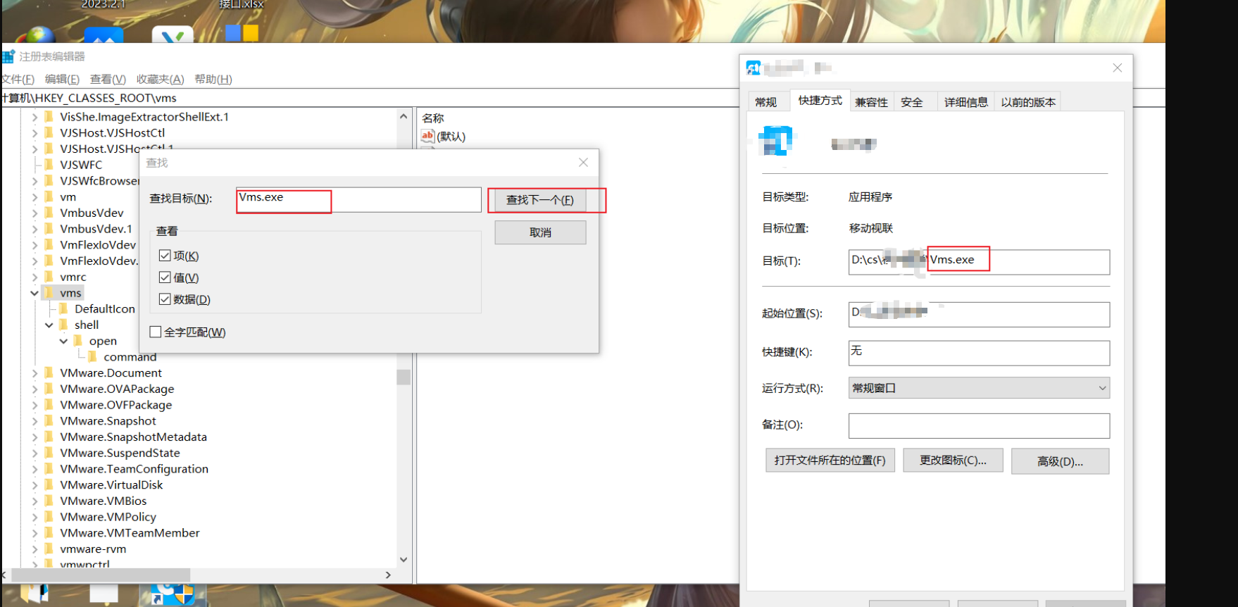 一般情况下可以直接在计算机\HKEY_CLASSES_ROOT\ 后面加XX.exe的名称(比如我这里是vms.exe那就可以直接输入计算机\HKEY_CLASSES_ROOT\vms)查看信息,如果写安装程序的人不讲武德名字要搞得不用样就只能搜索XX.exe文件了。